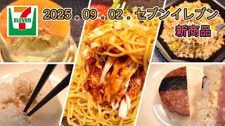 9月2日発売 5品 セブンイレブン新商品 炙り焼きチャーシュー炒飯、こだわりおむすび 炭火焼さば、直火焼ソーセージのおむすび、香麻辣油仕立て四川風よだれ鶏冷し麺、7プレミアム おいものすふれ 3号